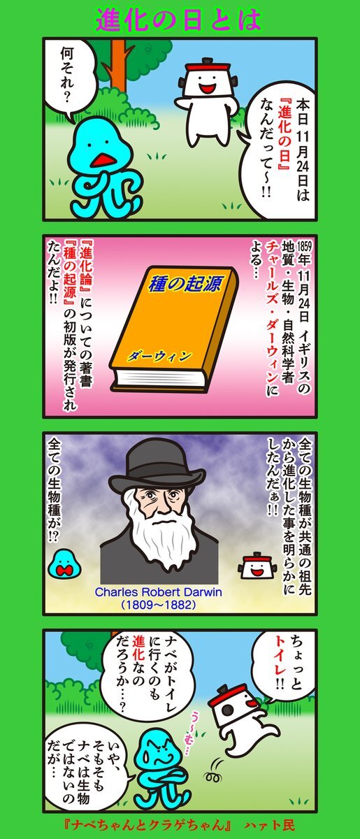 【ほのぼの漫画】ナベちゃんとクラゲちゃん 『進化の日』 #ナベちゃんとクラゲちゃん #4コマ漫画 #ほのぼの #ハァト民 #進化の日 #ダーウィン #進化論 #種の起源 ※毎週月曜夜更新(基本) ※今までのお話は、pixivにて『ナベちゃんとクラゲちゃん』で検索してね♫ pic.x.com/oiGD8uPy3P