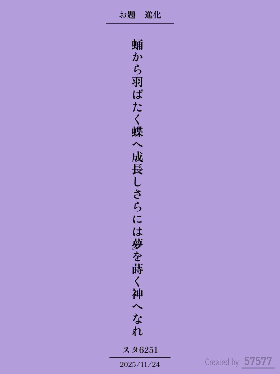 蛹から羽ばたく蝶へ成長しさらには夢を蒔く神へなれ/スタ6251 進化にまつわる短歌を募集✨「進化」という言葉を詠み込まなくてOKです 11月24日 進化の日。1859年ダーウィン『種の起源』発売 #進化の日 #進化をテーマに短歌を作ろう pic.x.com/UY9IHlhzrI x.com/tankazine/stat…