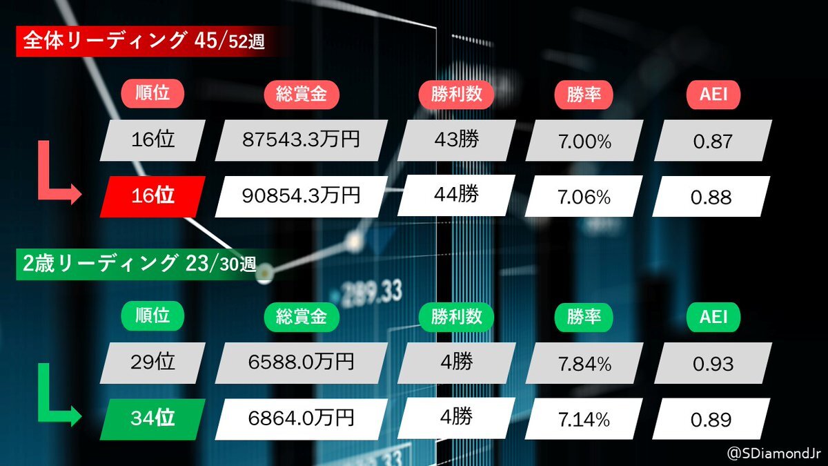 【中央種牡馬リーディング】 全体 16位→16位 主な賞金加算 ローディアマント(3035.0万円) 2歳 29位→34位 主な賞金加算 テルケンレンスキー(220.0万円) #サトノダイヤモンド産駒 pic.x.com/50T4fOq45B
