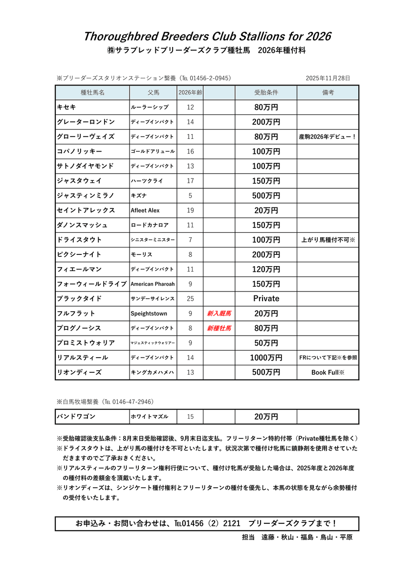 【#ブリーダーズSS 2026年種付料ℹ️】 2026年のブリーダーズスタリオンステーション繋養種牡馬の種付料が決定いたしました! 皆様からのお申し込みをお待ちしております! (TEL:01456-2-2121)