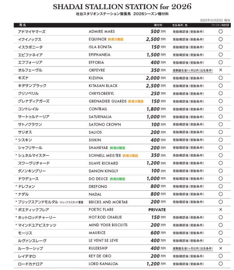 2026年社台SS種牡馬種付け料 2,500万 キタサンブラック・イクイノックス 2,000万 キズナ 1,800万 コントレイル 1,500万 エピファネイア ダビスタ96で競馬を始めた世代としては、輸入馬でなく1,000万以上を内国産種牡馬が占める時代が来るなんで当時絶対に信じないし凄い時代の変化だよなぁ。 pic.x.com/iytSOjDubP
