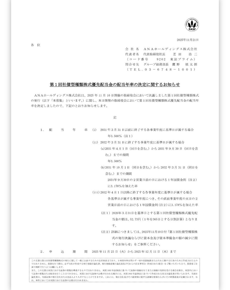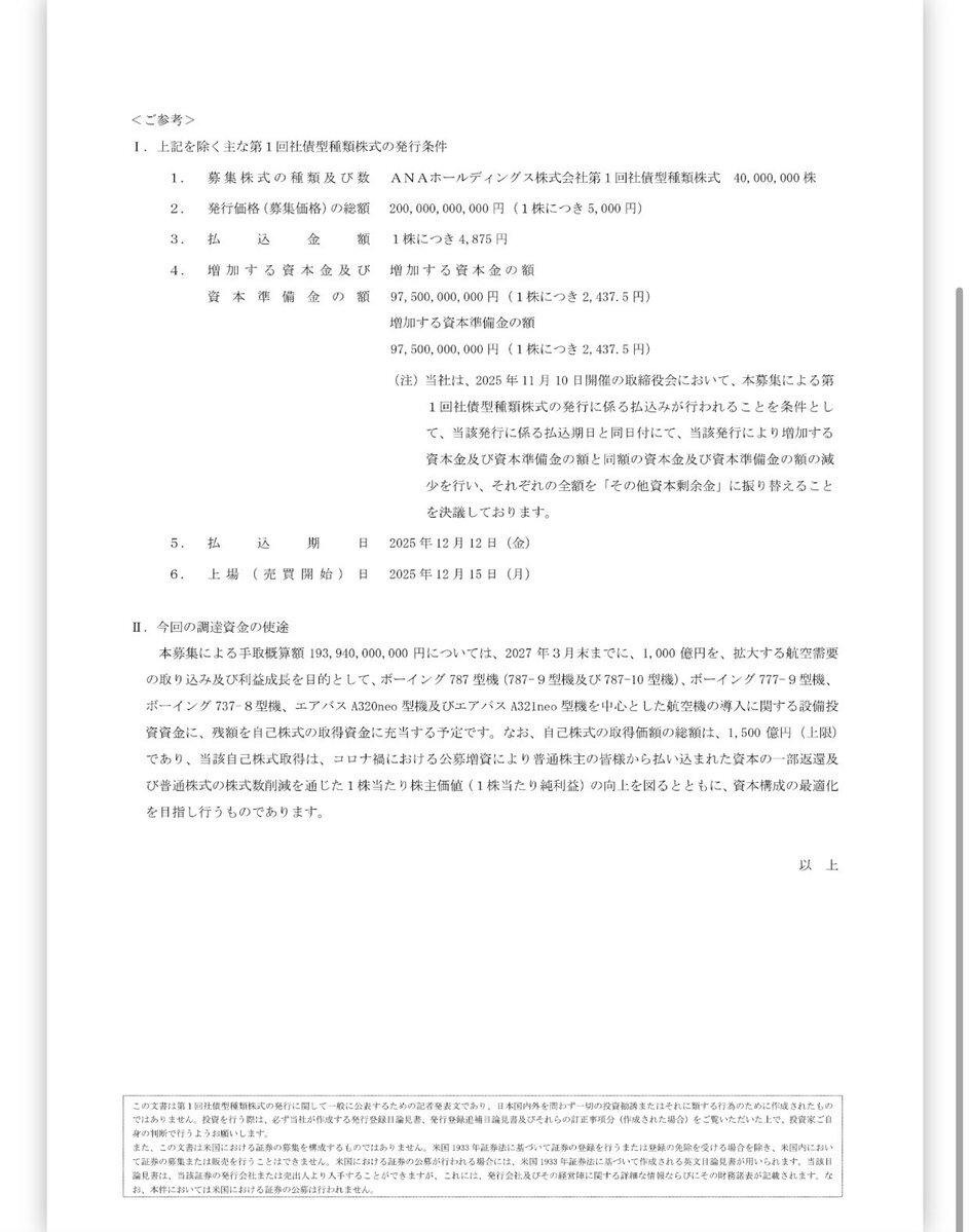 ANAホールディングス 社債型種類株式:発行総額2,000億円・年率3.5%での条件決定を発表。 議決権のない種類株で資金を調達し、成長投資と自社株買い(EPS向上)を同時実行する資本戦略。 資金使途 ↓ ① 設備投資(約1,000億円)  ・B787-9/10, B777-9, B737-8  ・A320neo等の航空機 ② pic.x.com/ee2NX1MiaR