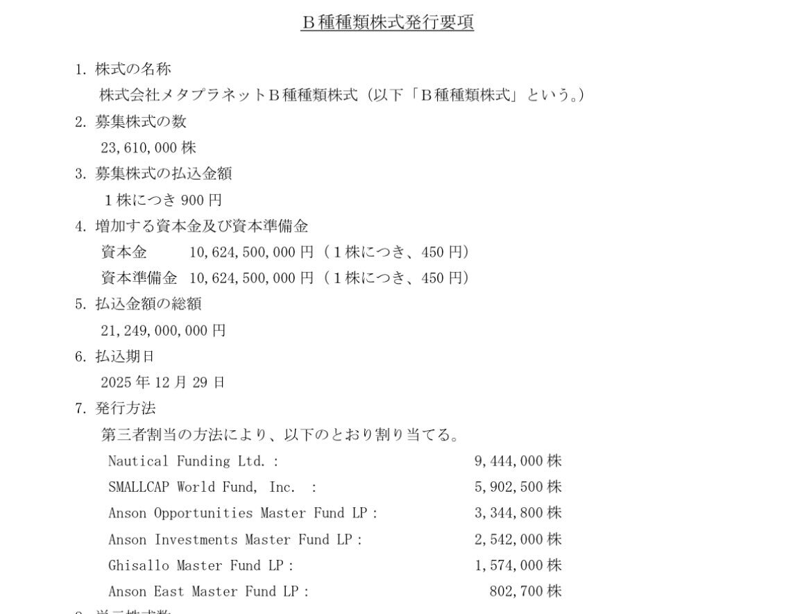 メタプラネット、第三者割当増資、B種種類株式を1株900円で2361万株、ビットコインの購入等に充当、海外投資家に割当