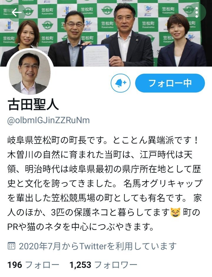 例の騎手の話が影響してるかわからんが 笠松町長のTwitter @olbmIGJinZZRuNm なくなってるんだよな・・・。 pic.x.com/fbNzPAcE8C