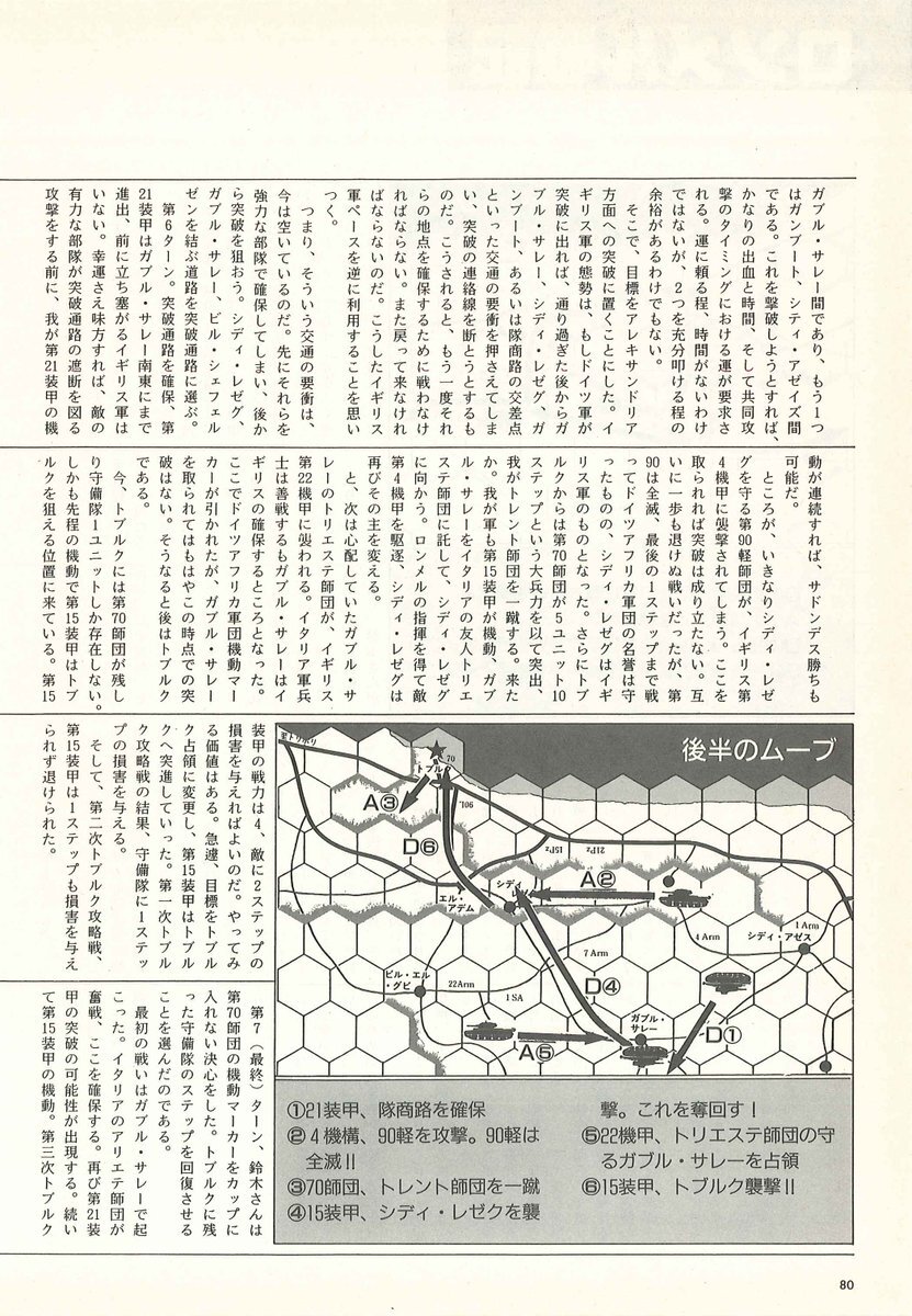 Rommel's Afrika Korps (1988) Designer: Ginichiro Suzuki 「シミュレイター」(新)第20号(1989年1月15日発行) 『ロンメルアフリカ軍団』はソロプレイにも最適のゲームである。引かれたチットによって移動・戦闘の行えるユニットがランダムに決定される。 pic.x.com/kzBEnzPDeM