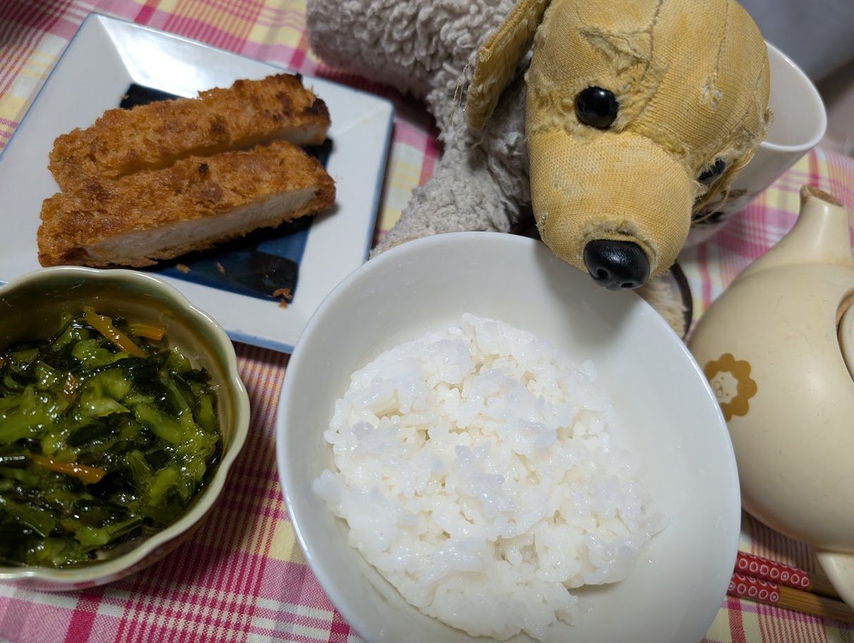 今夜は (个ω个) 簡単晩御飯@ きのー買って来た、お安いトンカツを2切れ、野沢菜昆布を少しでね? 最後は、お茶漬けで頂いたのです。 そして、眠気に襲われタイムなのです。 お風呂で髪も洗ったし、きょーは頑張った方なのです。 #しゃのさんの手料理 pic.x.com/J7BtyYfpbV