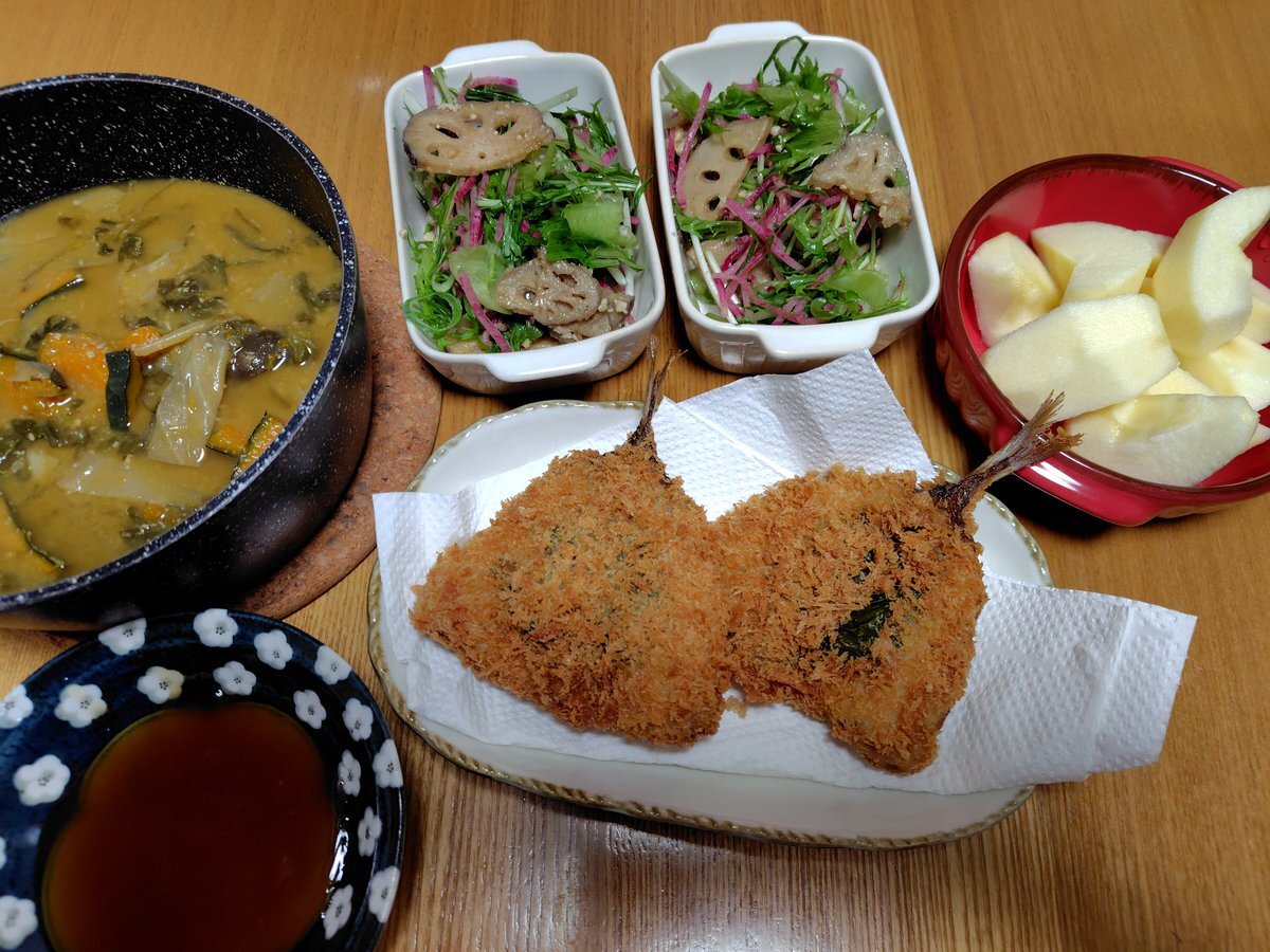 この連休は体を休ませて頂きました✌️ さ、今週も仕事やらなんやらで またちょいと忙しくなるので頑張ろ💪 簡単晩御飯… ◎昨日の根菜お味噌 ◎紫蘇のせアジフライ ◎レンコンの胡麻和えサラダ ◎りんご🍎 今週もよろしくお願い致します😊 pic.x.com/bAk40s6L6j