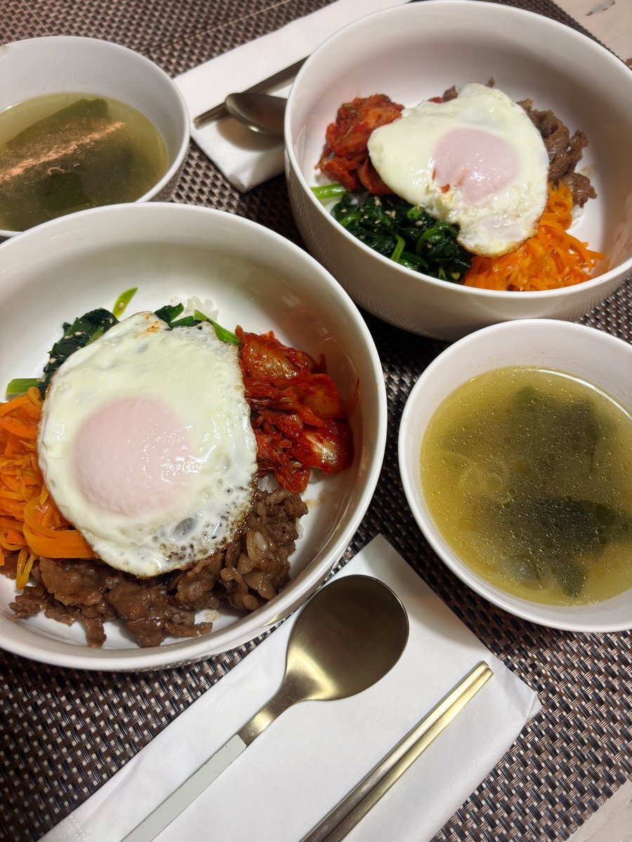 今日は、簡単晩御飯😅 豆もやしないけど💦 ほうれん草、人参ナムル キムチ、牛肉でビビンパ pic.x.com/5AN5U1SVo0
