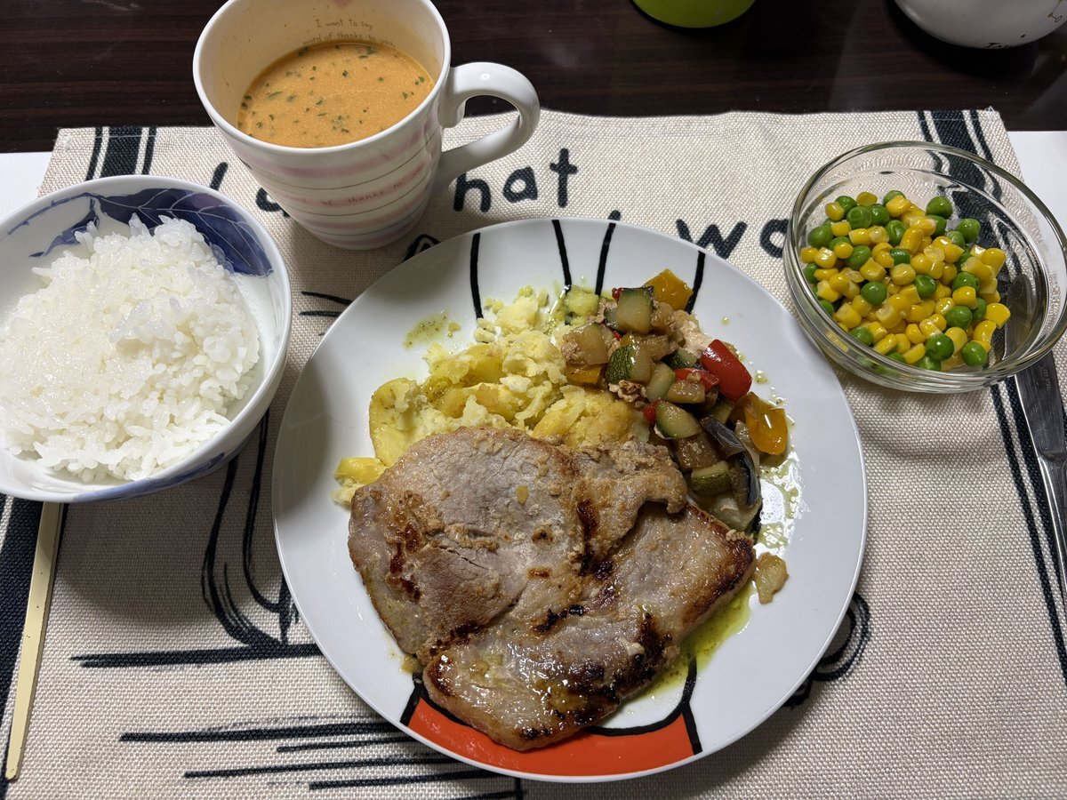 こんばんは 今夜は簡単晩御飯 塩麹漬けの豚肉ソテーと市販の濃厚海老のビスク うっかりお茶碗にご飯よそいました お皿の方がオシャレなのに 何はともあれ恵に感謝 いただきます pic.x.com/U026UjFzww