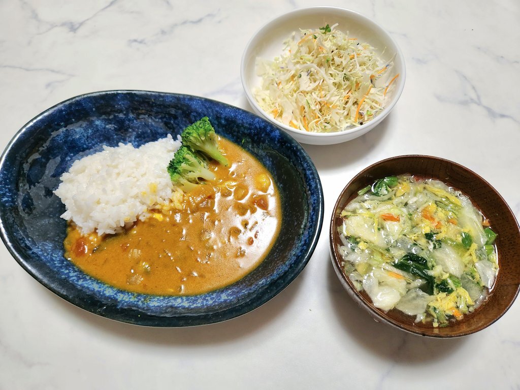 今日の晩御飯 体がしんどかったので作り置き一品+副菜を作る予定を変更、明日用に作っておいたシーフードカレーと市販のサラダとフリーズドライの野菜スープで簡単晩御飯。 明日の副菜作りは明日の私に任せて今日の私は体調整える為にさっさと寝ます😪 #おうちごはん𓎩𓌉𓇋 pic.x.com/TGnBcnN44l
