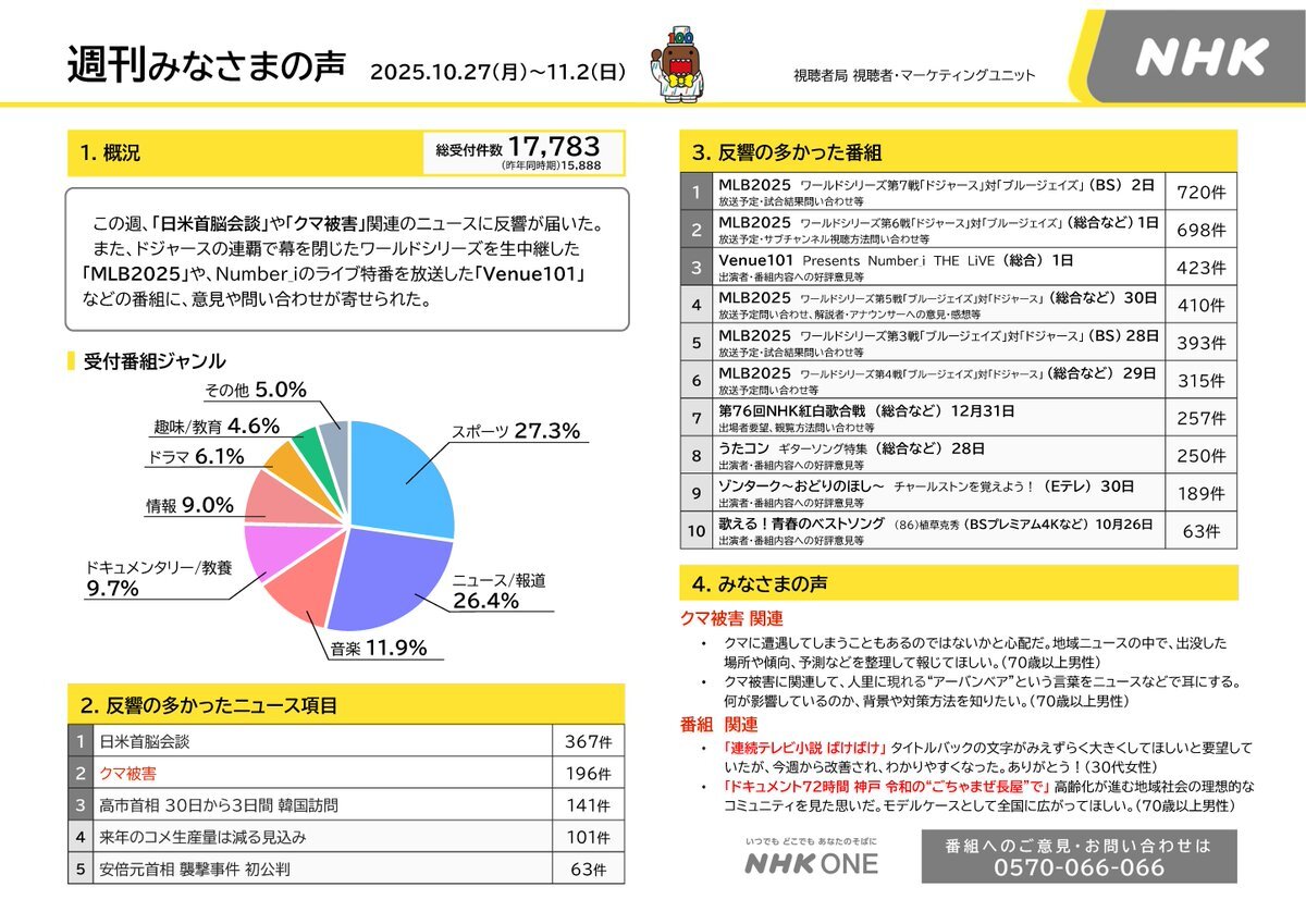 【週刊みなさまの声】 10月27日~11月2日に寄せられた声は1万7783件でした ありがとうございます 「日米首脳会談」や「クマ被害」関連のニュースに反響が届きました また、「MLB2025」やNumber_iのライブ特番を放送した「Venue101」などに意見や問い合わせが寄せられました nhk.or.jp/css/koe/