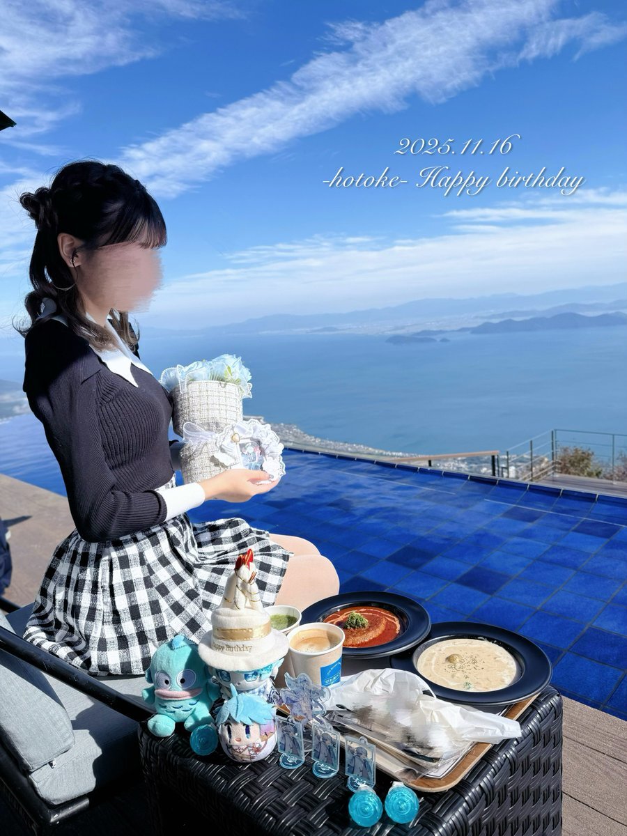 青空とプールがいむくんカラーで景色も綺麗だし素敵すぎる🩵なによりバースデー仕様のいむくんぬいがかわいすぎるね🥹🩵素敵なお祝い本人に届きますように⟡.· x.com/niwatori_pan/s…