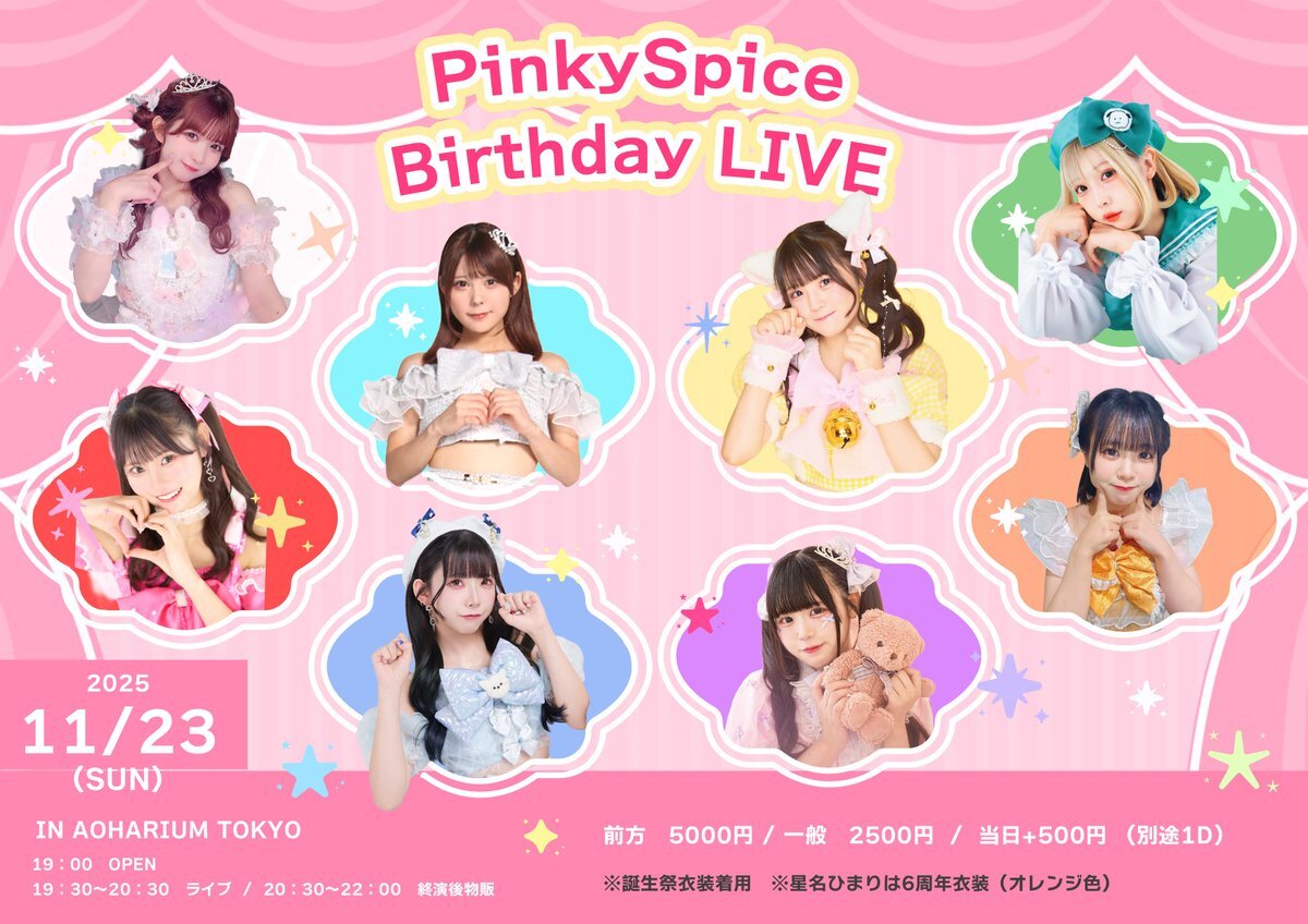 🔵11/23(日)ライブ情報🔵 / PinkySpice Birthday LIVE \ ピンスパ結成7周年当日の記念公演 一緒にお祝いしましょう🎂♡ 📍アオハリウム東京 ⏰開場時刻 19:00 / 開演時刻 19:30 👗衣装:誕生祭衣装 ※星名ひまりは6周年衣装 🎫 t-dv.com/UxguGPLceTLlCw… 前方エリア ¥5000 ・抽選受付締切