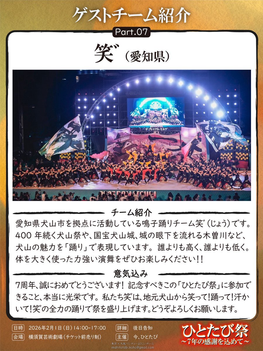 ご紹介ありがとうございます! そしてチーム結成7周年おめでとうございます👏 実は「今、ひとたび」の代表は10年ほど前に笑゛で踊っていたご縁があります。 当時を知るメンバーも交えて、7周年を盛大にお祝いさせていただきます! #ひとたび祭 #今が一番タイミング x.com/ima_hitotabi/s…