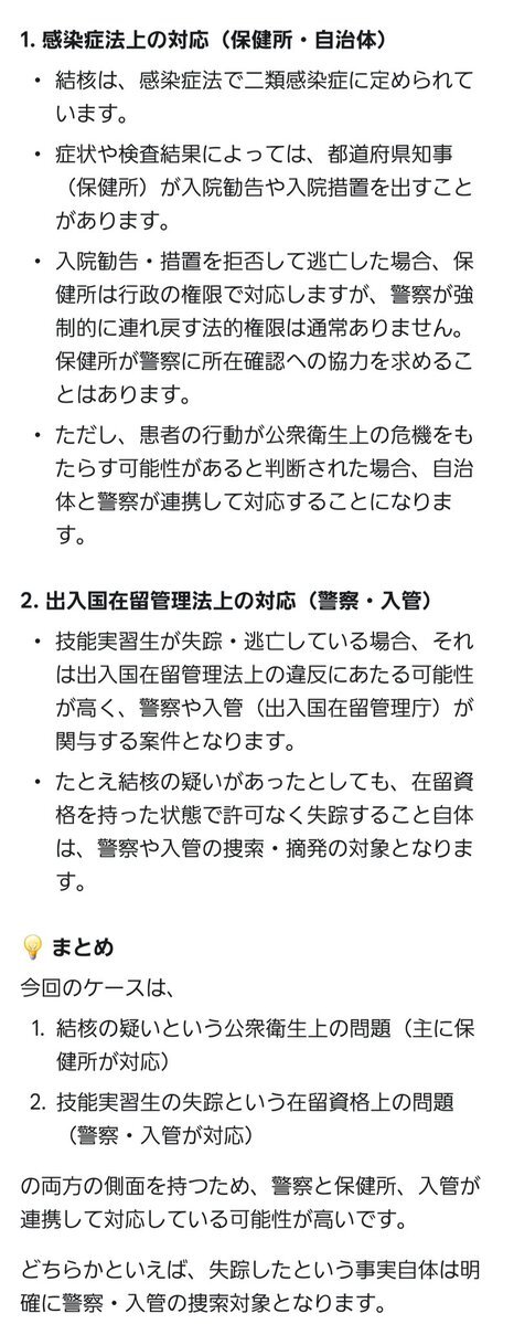 "結核疑い"って……。バイオテロすぎる。現状、技能実習制度は壊れている以前に犯罪者を入国させているのと同義になっている。技能実習生を選抜するシステムが正常に働いていない証拠。選抜方法の厳格化と失踪した場合の受け入れ企業への罰則も早期に明文化すべき。異常。 x.com/Tendai_777/sta…