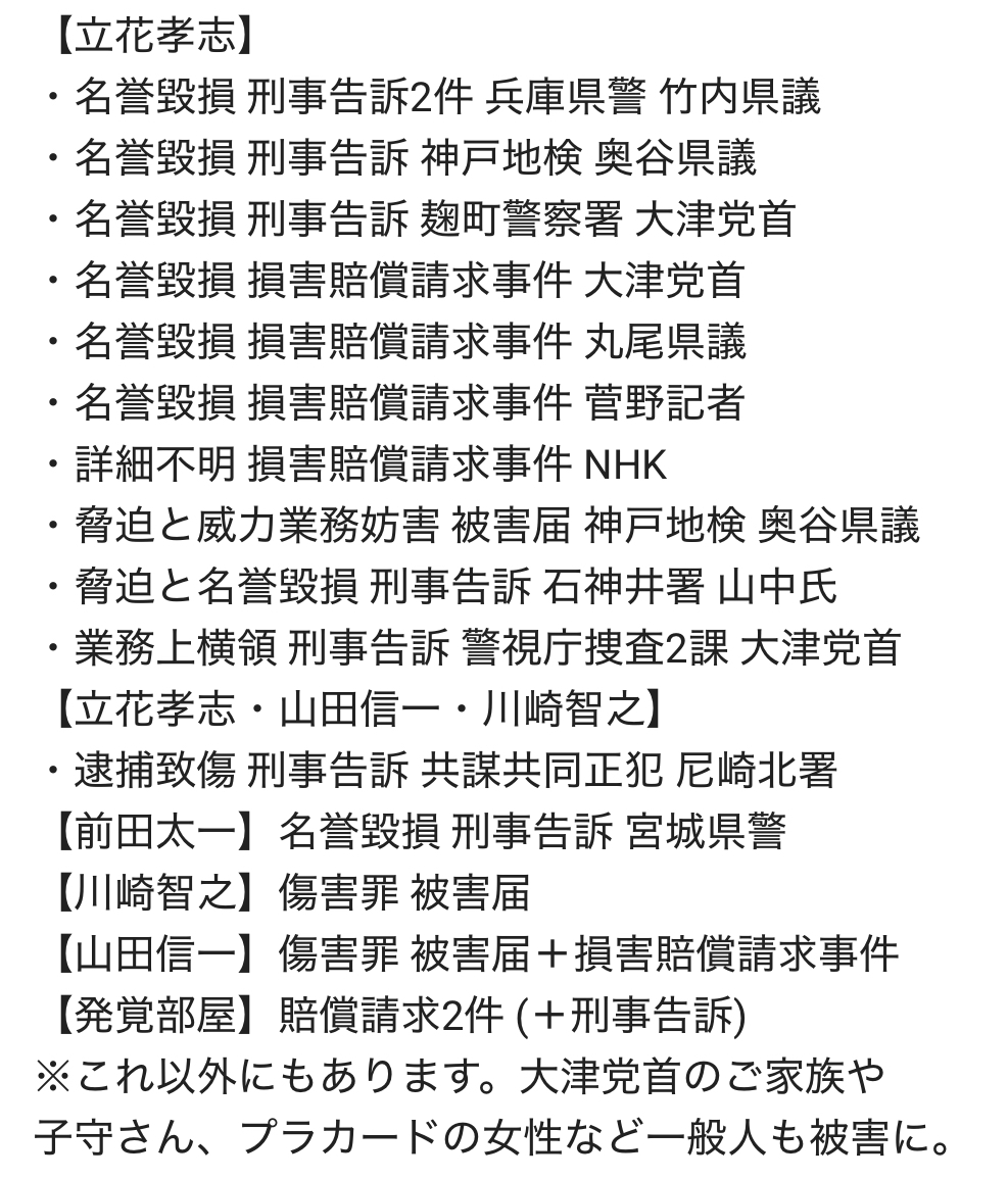 執行猶予4年の最中にも最低これだけ訴えられてる人が逮捕されない情けない日本。 この人の党は反社会的カルト集団と言われており、そこの議員が自民党会派入り。 この人は統一教会とも繋がりバックについてるのに自民党会派入り。 狂ってる。 x.com/mkm9962/status…