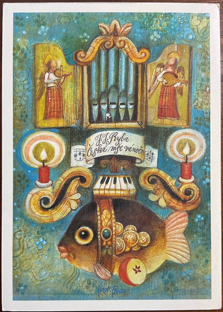 今日はチェコのクリスマスカードをポストします。1999年にプラハに送られたもので、チェコのイラストレーター/絵本作家Karel Franta(1928-2017)の絵が使われています。絵の中央には18世紀のチェコの作曲家Jakub Jan Rybaのミサ曲Česká mše vánoční が見えます。下の魚は何を象徴しているのでしょう? pic.x.com/duyfhi1WsX