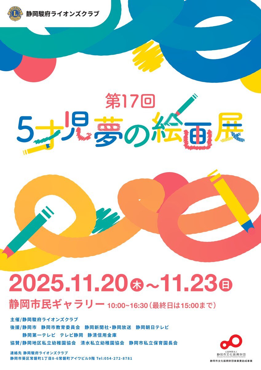 📣✨5才児夢の絵画展 開催中✨📣 5さいの“夢”って ほんとうにキラキラしてる🌈 「ぼくの夢・わたしの夢」🎵を テーマにした作品が 静岡市民ギャラリーに大集合‼️🎨 🗓11/20㈭-23㈰ ⏰10:00-16:30(最終日15:00まで) 📍静岡市民ギャラリー 主催:静岡駿府ライオンズクラブ🦁 ぜひ見に来てね💐 pic.x.com/EGOcQLZ3v9