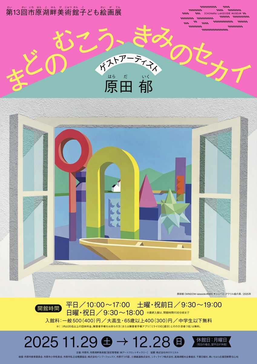 🟣🪟11/29㈯開幕!🪟🟢 第13回市原湖畔美術館子ども絵画展 「まどのむこう、きみのセカイ」 ゲストアーティスト:#原田郁 約300 点の子ども達の作品が選出!原田さんの作品と共に展示いたします。初日の11/29㈯13時-15時には、原田さんのワークショップを開催!🔴lsm-ichihara.jp🔴 pic.x.com/zSZ4QlTMwp