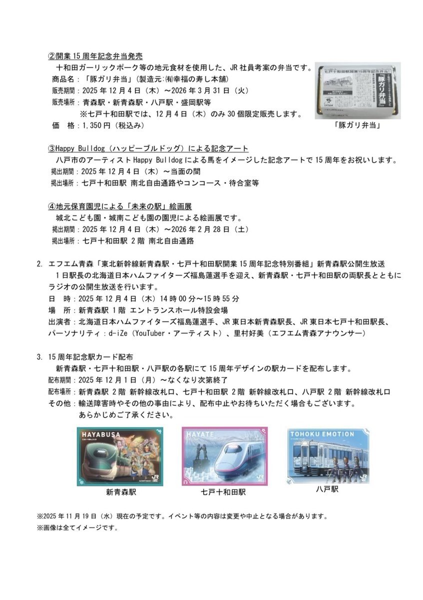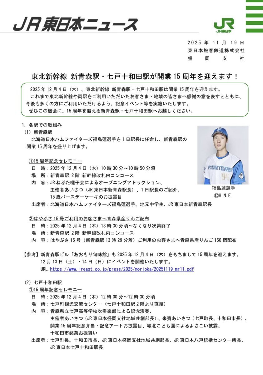 【㊗️新青森駅・七戸十和田駅15周年🎉】 〈#新青森駅〉 12/4北海道日本ハムファイターズの福島蓮選手(八戸市出身)が1日駅長に就任⚾️記念セレモニー、FM青森公開生放送、県産りんご配布も🍎✨ 〈#七戸十和田駅〉 12/4記念セレモニー、15周年記念弁当、記念アート、地元園児絵画展🍱🎨 #青森市 #七戸町 pic.x.com/ASx5SOcv4h