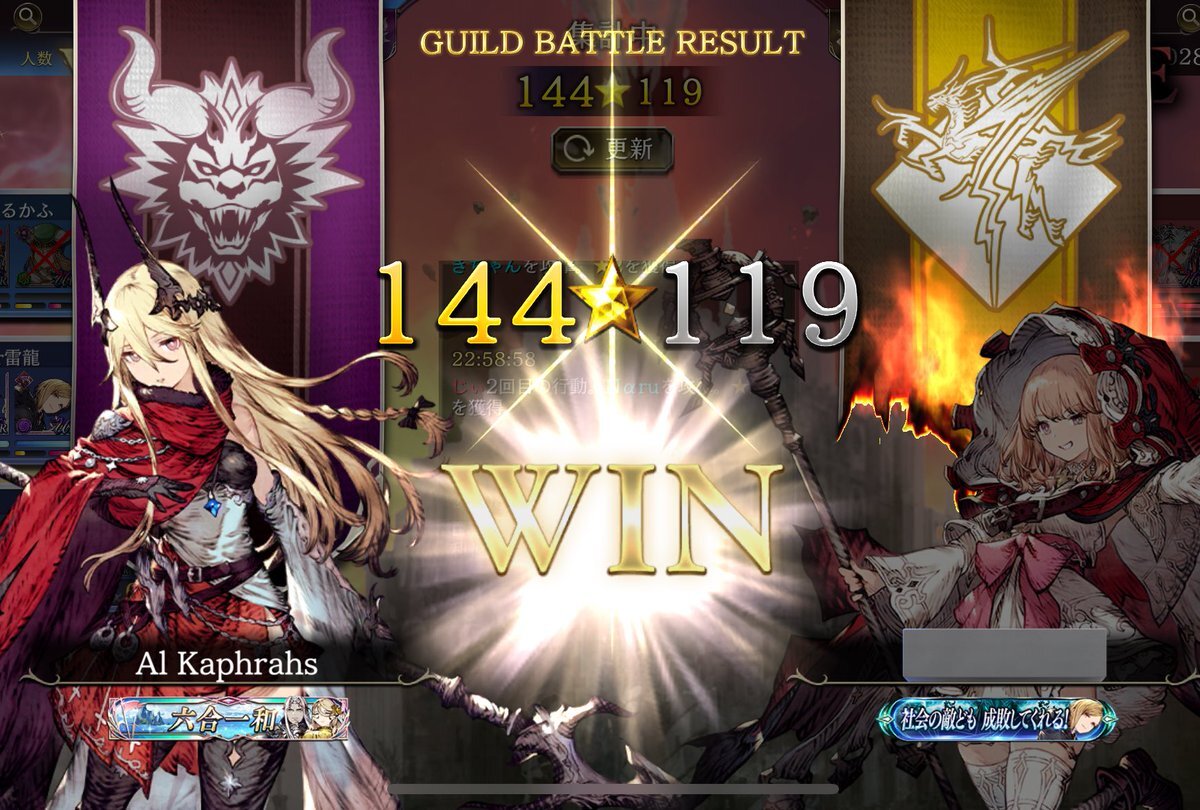 限定最終戦も勝利!\( 'ω')/ 首位を守るには絶対に負けられない3位のギルドさんとの戦い!2位のギルドさんとのポイントは僅差でとにかく星をなるべくとらないと! 全員攻撃で144星、あるかふ連携パワー出し切りました(*´Д`*) #あるかふ🧸 #幻影戦争 pic.x.com/w2RFhyGkSt