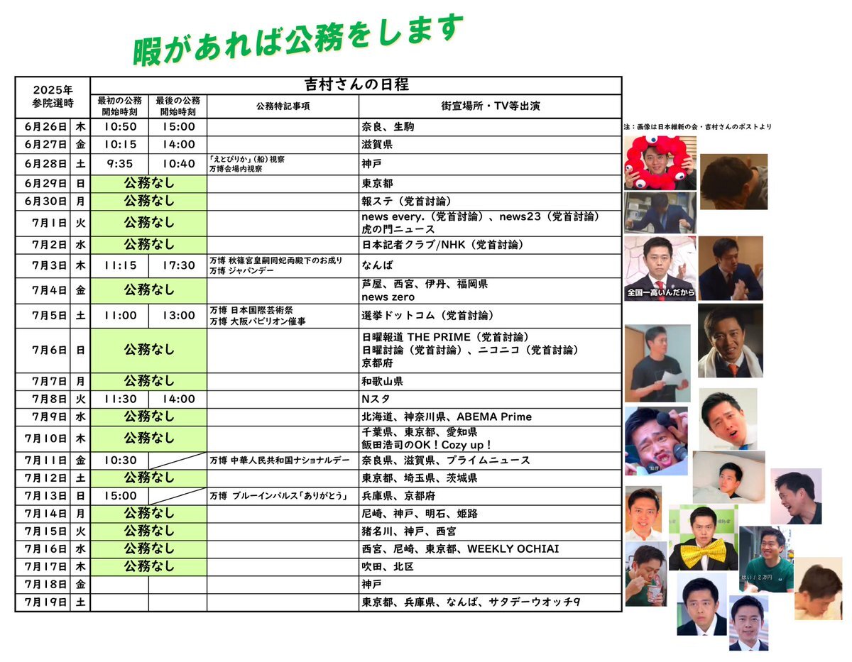 この2025年、参議院選挙期間中の吉村知事「公務無し」日程を見ても「仕事こなされてる」と言うのかね。デマでもなんでもなく、選挙になれば、全国どこでも平日の昼間から維新の選挙活動、それが維新の会代表吉村洋文。やる気が無いなら府知事は辞めたらよろしい🥦 pic.x.com/w2JOwgtGYS x.com/fix_skydog/sta…