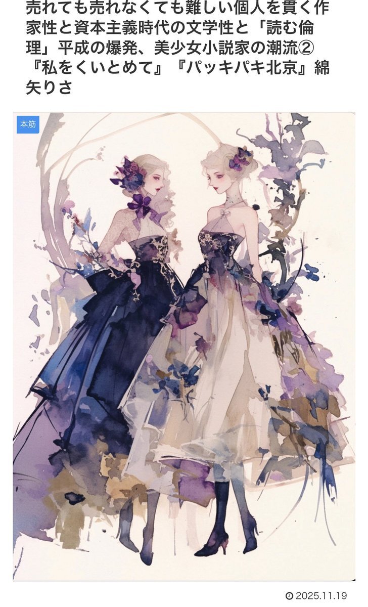 平成が生んだ美少女小説家の潮流①完璧な初期三部作に惚れ惚れするはずだった『夢を与える』綿矢りさ #読了 「女性がまだ誰かの言葉で語られていた時代を、自分の身体で語り始めた時代へと変えた」上位男性が上からではなく若い女性の内から始めた文学。 衝撃の同時受賞後の作品は? ブログ更新🆙 pic.x.com/6AqYguhk8e