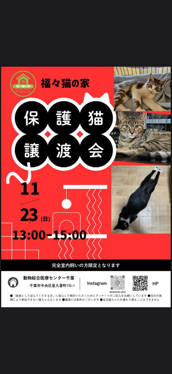 🐱#猫の譲渡会一覧~2025年11月23日 ●11月23日(日) 場所:千葉市中央区星久喜町170-1 会場:動物総合医療センター千葉 時間:13時~15時 #関東・猫の譲渡会・11月23日 #譲渡会 #里親会 #里親募集 #猫 ✱詳細➜instagram.com/koneko_hahanek… pic.x.com/uTKsdfboBn