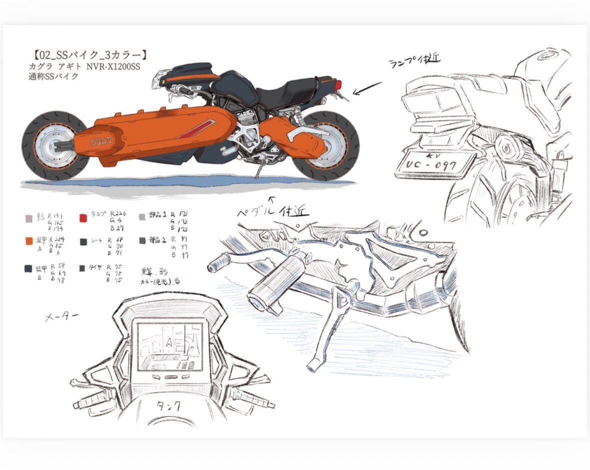 今回の自主制作アニメに登場するバイクですが、このような設定画をあらかじめ作りました。 ここから知人に依頼してCGを作り、Clip Studioで操作できるようにしてもらいました。 使う際は光源の調整や線画抽出をして影をつけたものを参考にして、手書きで1カットずつ線・色・影を描き込んでいます。 pic.x.com/JzfFawm5OW