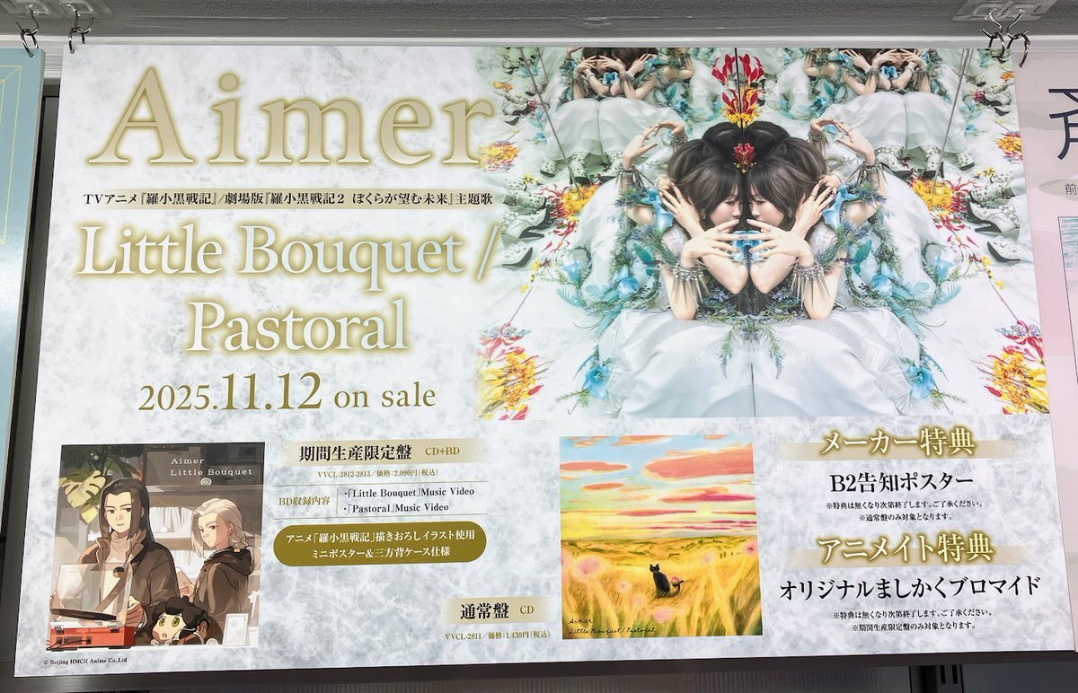 【#Aimer】 『Little Bouquet/Pastoral』 本日発売です‼️ 10月放送TVアニメ『羅小黒戦記』・11月公開劇場版『羅小黒戦記2 ぼくらが望む未来』の主題歌を1作品に集約した贅沢な一枚🥺✨ ご来店お待ちしております😺 pic.x.com/kwuXD37b7w