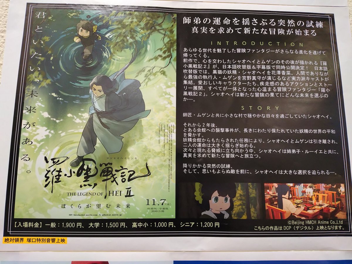 塚口サンサン劇場さんにて「羅小黒戦記2ぼくらが望む未来」の字幕を絶対領界音域塚口特別音響上映で観ました。 楽しみにしすぎたあまりいつも以上に情報を入れないようにして公開日も劇場チェックも忘れていた始末。主にシャオヘイとルーイエの物語よねなんて心の準備してたけどもうムゲンさま!!! pic.x.com/K8HxczcA3t