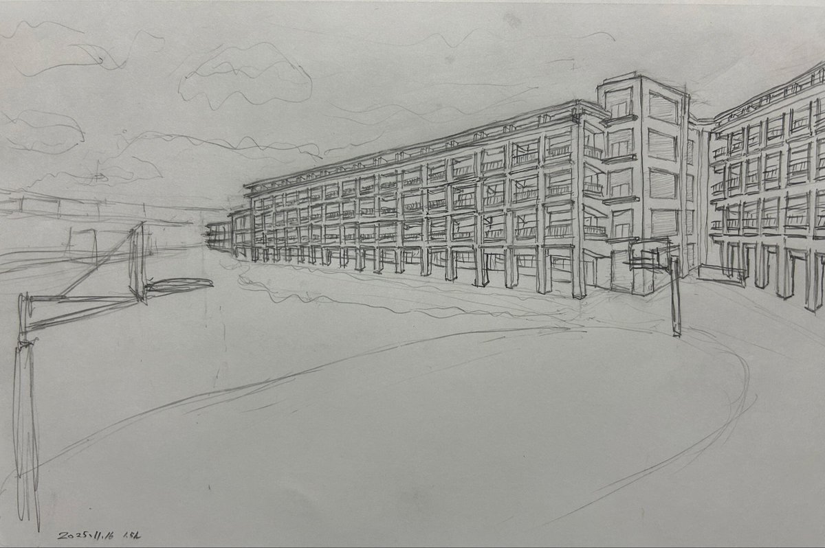 さいたま市立美園小学校 正方形の敷地の対角線状に長手を取って、くの字の校舎が配置されている。周囲の開けた農地と校舎とでグラウンドで遊ぶ子供をゆるやかに囲み、見守るかのよう 意匠には古典建築とモダニズム建築を踏まえた実直さがあり、連続したバルコニーが自由さと彫りの深い温かみを醸す pic.x.com/rndz0zIMac