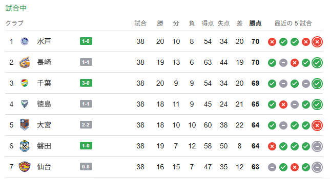 千葉は3-0とリードを広げていく 水戸は後半頭に先制して一気に優勝に近づく 長崎は1点ビハインドであるものの、追いつけば自動昇格圏内に入れる この1ゴールで状況が変わっていくのが最終節ならではの面白さ