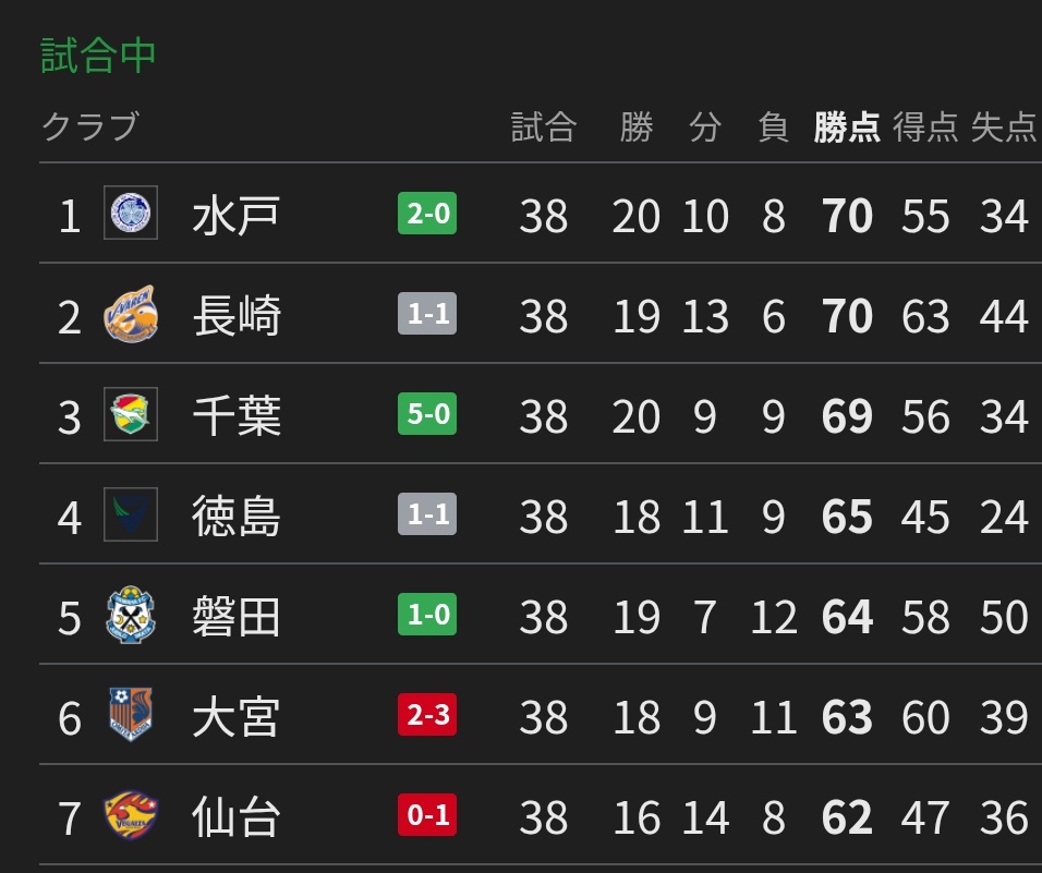 水戸と千葉が勝っているので、長崎は負けると優勝を逃すどころか、自動昇格圏内からも一気に外れて昇格トーナメント行き。。凄い展開だなσ(^_^;) と思ったら、レンタルで長崎に加入した翁長が同点ゴール!!引き分けなら得失点差で優勝🏆を逃しても、自動昇格の権利は確保できる!!
