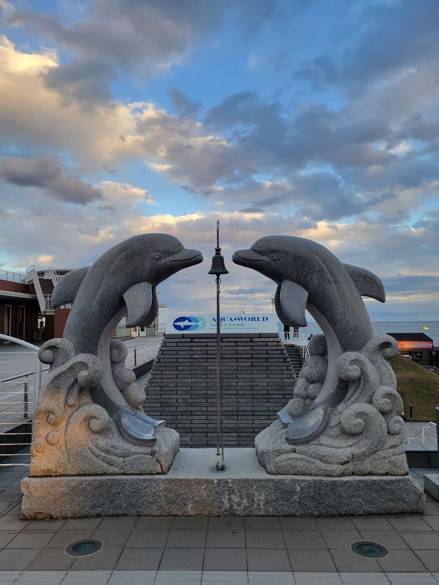 本日もお疲れさまでした! 写真は茨城県大洗町にある 『アクアワールド茨城県大洗水族館』 サメの飼育種類数が日本一を誇るそうです🦈 エントランス前にはサメではなく イルカのモニュメントがあります🐬🐬 #企業公式がお疲れ様を言い合う #茨城県民の日 pic.x.com/g4ZhmY1dVf