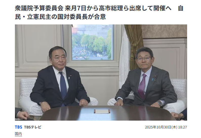 NHK ONE 18時39分配信記事 「臨時国会の審議日程をめぐり、自民党と立憲民主党の国会対策委員長が会談、11月7日と10日、それに11日の3日間、衆議院予算委員会で高市総理大臣とすべての閣僚に出席を求め基本的質疑を行うことで合意」 →所信表明演説に対する各党の代表質問は両院で4日~6日の日程