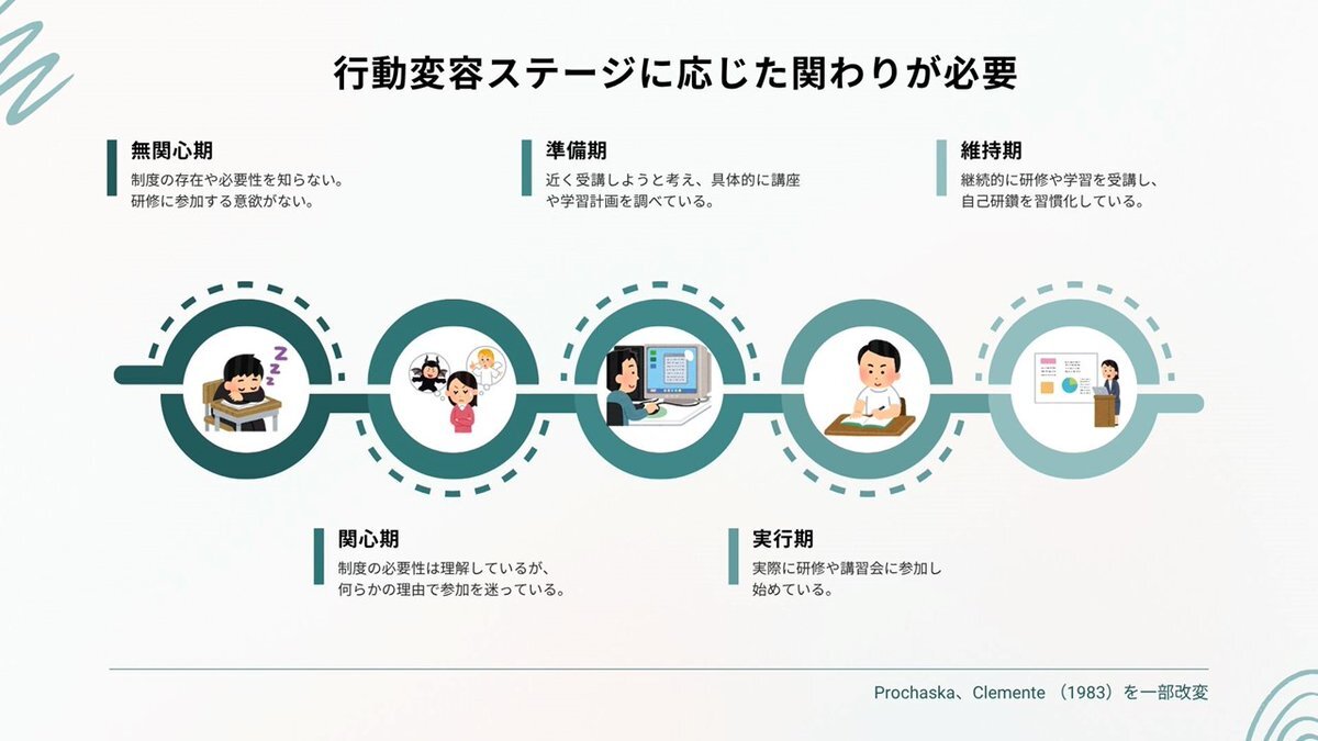 【生涯学習制度の履修を支援するために】 15時間の履修で修了可能な旧制度での新人教育プログラムも、修了率は75%でした。働きアリの法則(2:6:2の法則)でも言われていますが、履修への態度には差があるので、それぞれの行動変容ステージに応じた支援が重要であると思います。 #生涯学習制度 pic.x.com/Etd9AXPrfP
