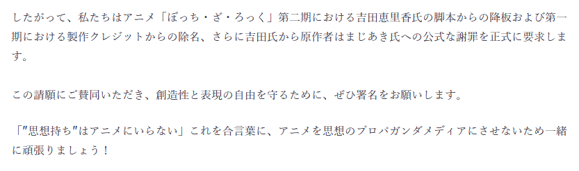 俺は表現の自由戦士なんだが、アニメ「ぼっちろっく」の脚本家の降板を求める署名運動(画像参照)には明確に反対する。表現の自由のために署名しないで欲しい。というか最後の二行が矛盾しているぞ!あと男性の大御所アニメ作家は思想が強い人ばっかりだぞ! pic.x.com/kvuxTGTxb6