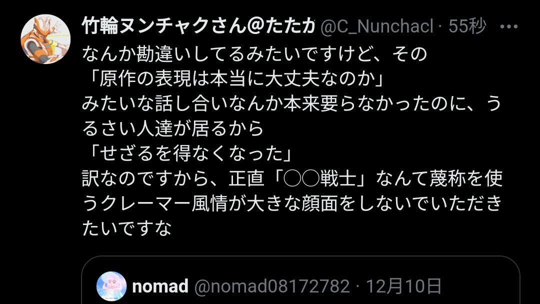 存在しない海外の圧力を持ち出す以外に、ぼざろと吉田恵里香さんの時みたいに原作者は建て前しか言えないから本音では納得してないかも知れないと言い始めて、勝手に自分の考える原作者の本音で攻撃する表現の自由戦士とかも登場するようになってきて、どんどんクリエイターさん本人は置いてけぼりに。 x.com/nomad08172782/…