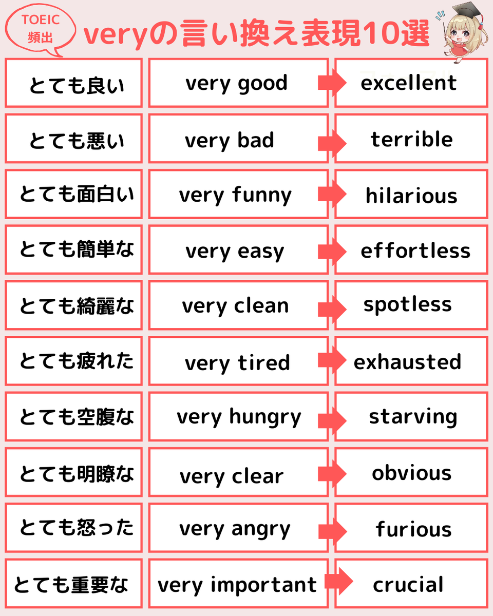 TOEICでも英会話でも頻出の『"very"の言い換え英語表現10選』をまとめました。いつも「very~」って言ってしまいがちな人も、コレ使えたらガチで英語の表現力が上がるから、ブクマして覚えてねっ!東京外国語大学を卒業した私の、"最強の英語学習習慣化術"は固定ポストです。 pic.x.com/15uCvsWmem