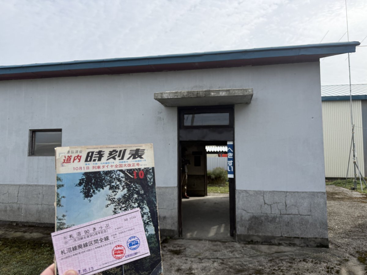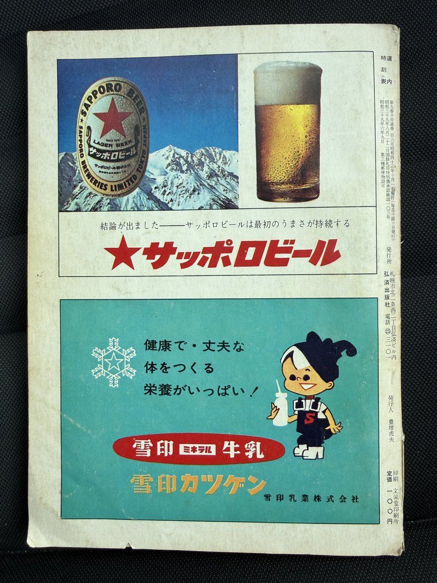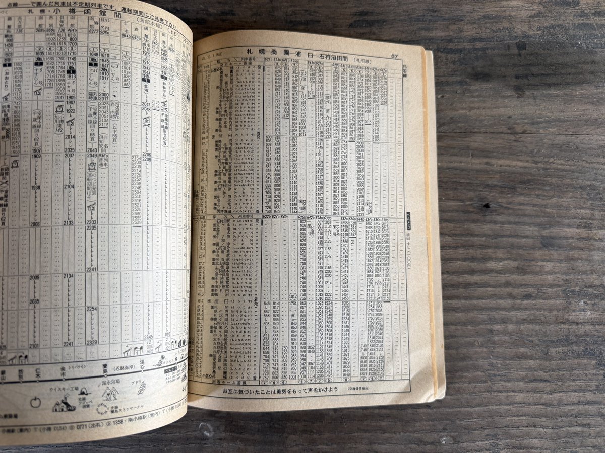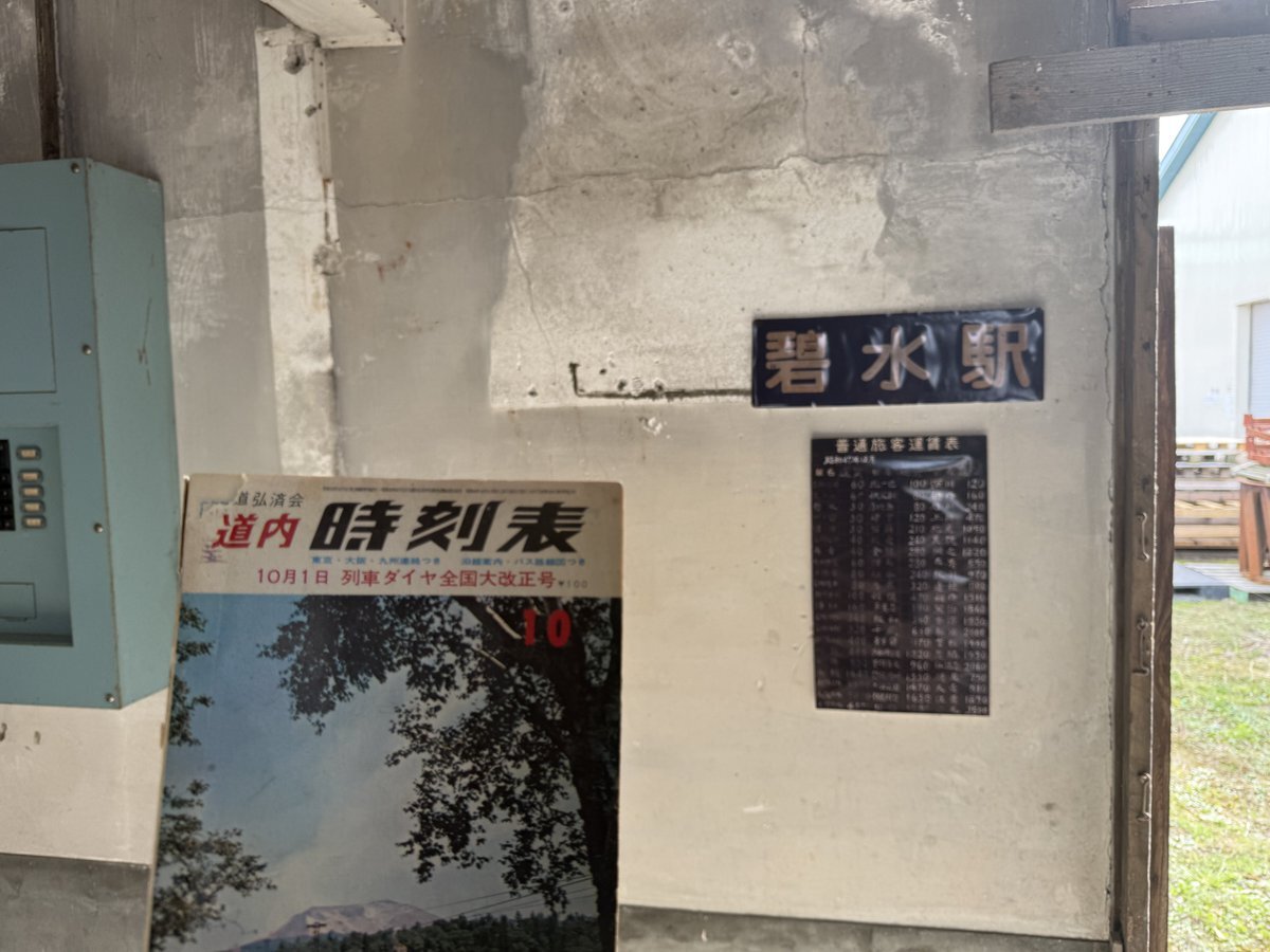 碧水駅に戻ってきました こちらでスタンプを押印 今日は道内時刻表をいくつか持ち歩いているので、札沼線の新十津川-石狩沼田間が現役だった昭和43年10月号と記念撮影 裏表紙のサッポロビールとカツゲンの広告も貼ります pic.x.com/jwFE5PhX8W
