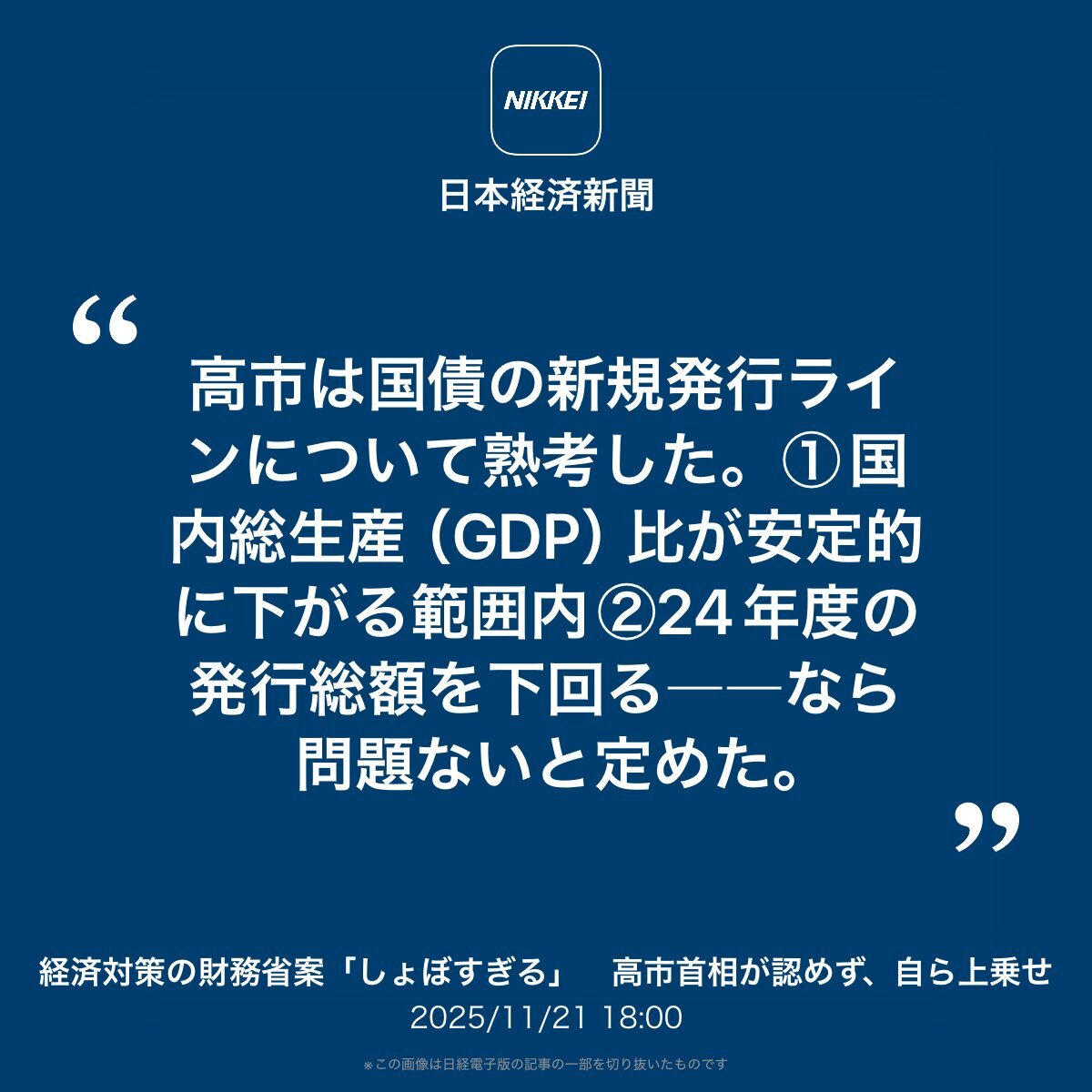 裏付けとなる2025年度補正予算案の一般会計からの歳出は17.7兆円となり、コロナ禍以降で最大規模の財政拡張となります。財源の多くを国債発行に頼るため、財政悪化への懸念や、むしろ円安を進行させさらなる物価高を招く逆効果になる可能性も指摘されていますが。。どうなるか🤔 x.com/kenchanfan_com…