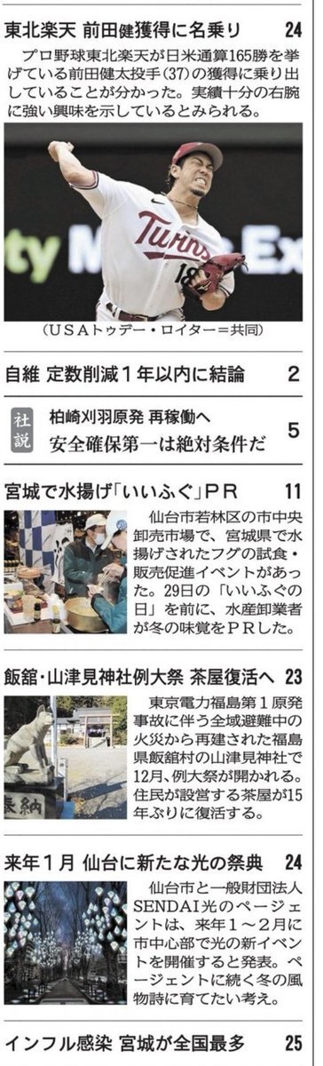 11月22日の河北新報です🌄 新潟県知事が柏崎刈羽原発の再稼働容認を表明。1月にも起動可能に 肩は政府が21.3兆円の補正予算案を決定。子ども一人当たり2万円給付など。 腹に宮城県議会の最大会派がネット中傷被害者への支援、被害防止の啓発に向けた条例制定を目指す方針に。 脇には囲碁の一力氏が五冠 pic.x.com/Zsbf0PF3Ad