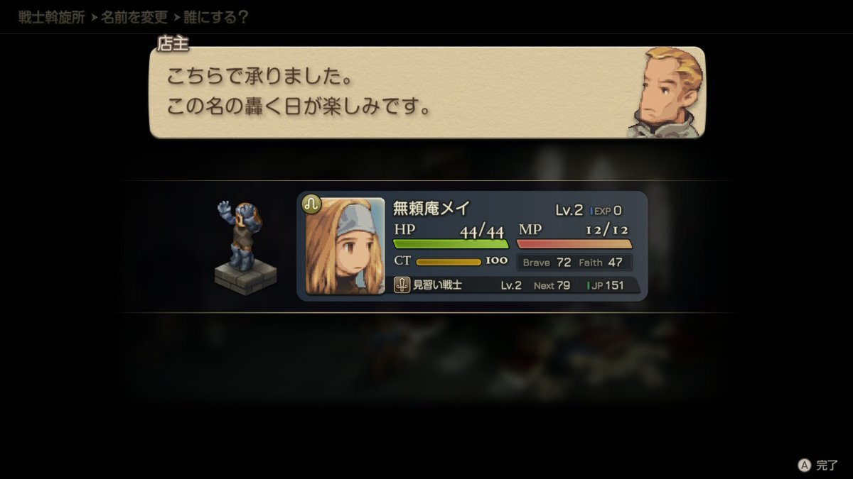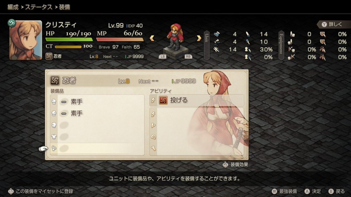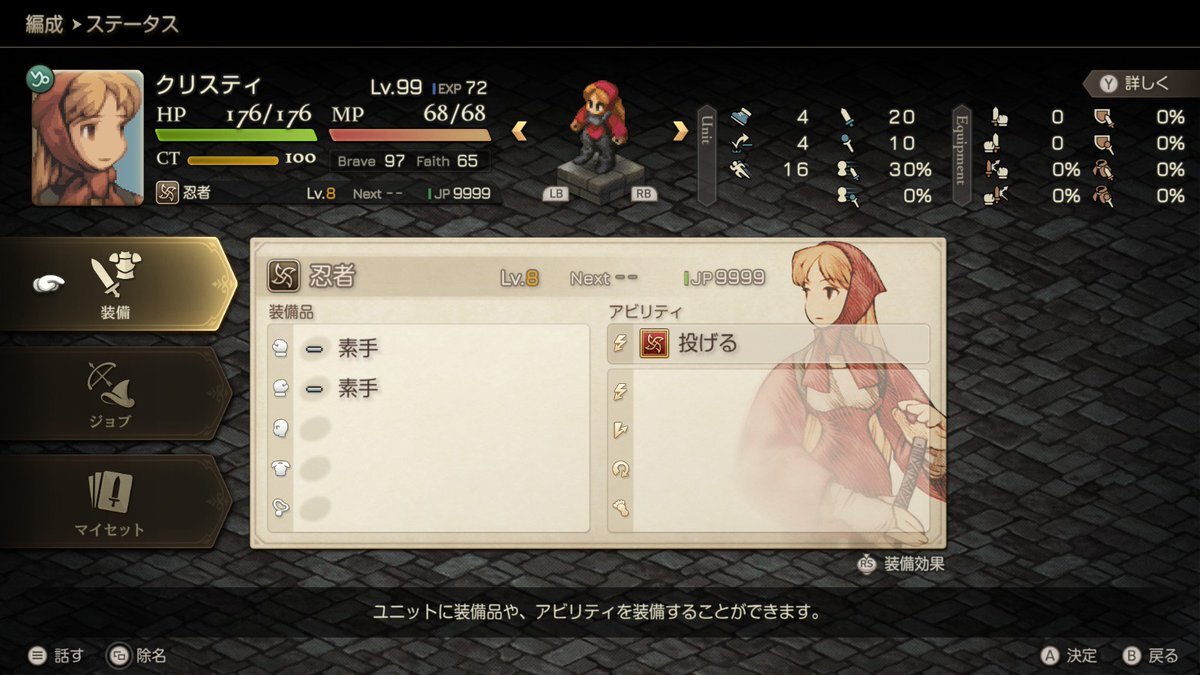 FFTリメイク始めたけど二章でトードで蛙一匹残して見習い戦士のためる稼ぎ始めたら、侍の白刃取りと算術(エールで加速しないとこんなSPEED低かったか?)覚えて、あとはもうエンディング見るだけだよな・・・