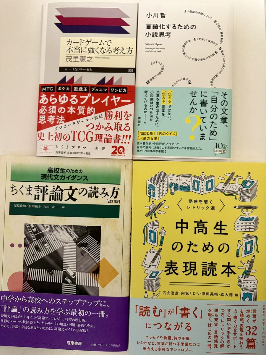 茂里憲之『カードゲームで本当に強くなる考え方(ちくまプリマー新書) 小川哲『言語化するための小説思考』(講談社) 吉田光・塚原政和・松田顕子『ちくま評論文の読み方 改訂版』(筑摩書房) 向坂くじら・森大徳・澤田英輔・石丸恵彦『中高生のための表現読本』(筑摩書房) #今日買った本 pic.x.com/E9P3BttVMJ