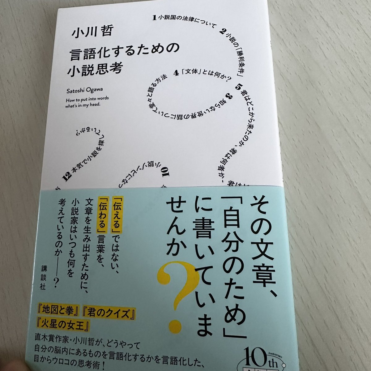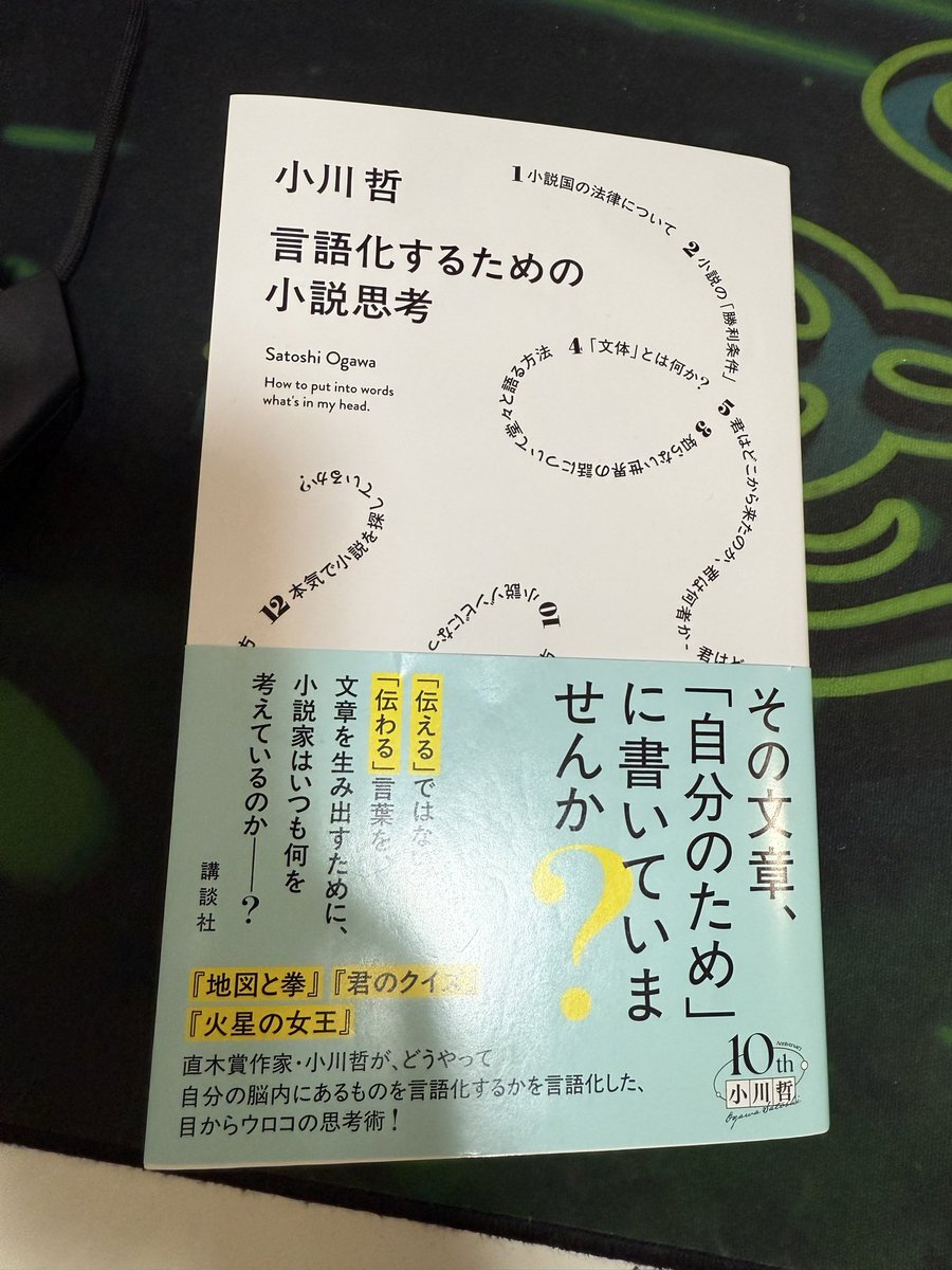 会社の新人君が、私が小説書いてることを知って「これ面白かったです!是非!」と『言語化するための小説思考』(小川哲)を貸してくれたので読んでます。どんなことを考えながら小説を書くかとか考えたことないので、視野が開けますね。