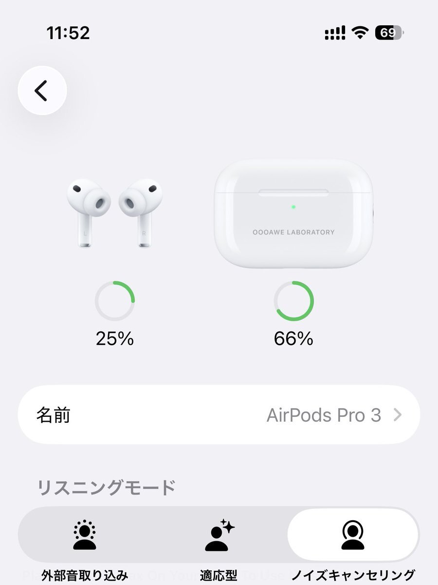 AirPods Pro3 刻印入れたの届く。ペアリングや設定画面でも常に表示される...Appleの愛着ブーストUI設計すごい。 pic.x.com/n20aiPC3T1