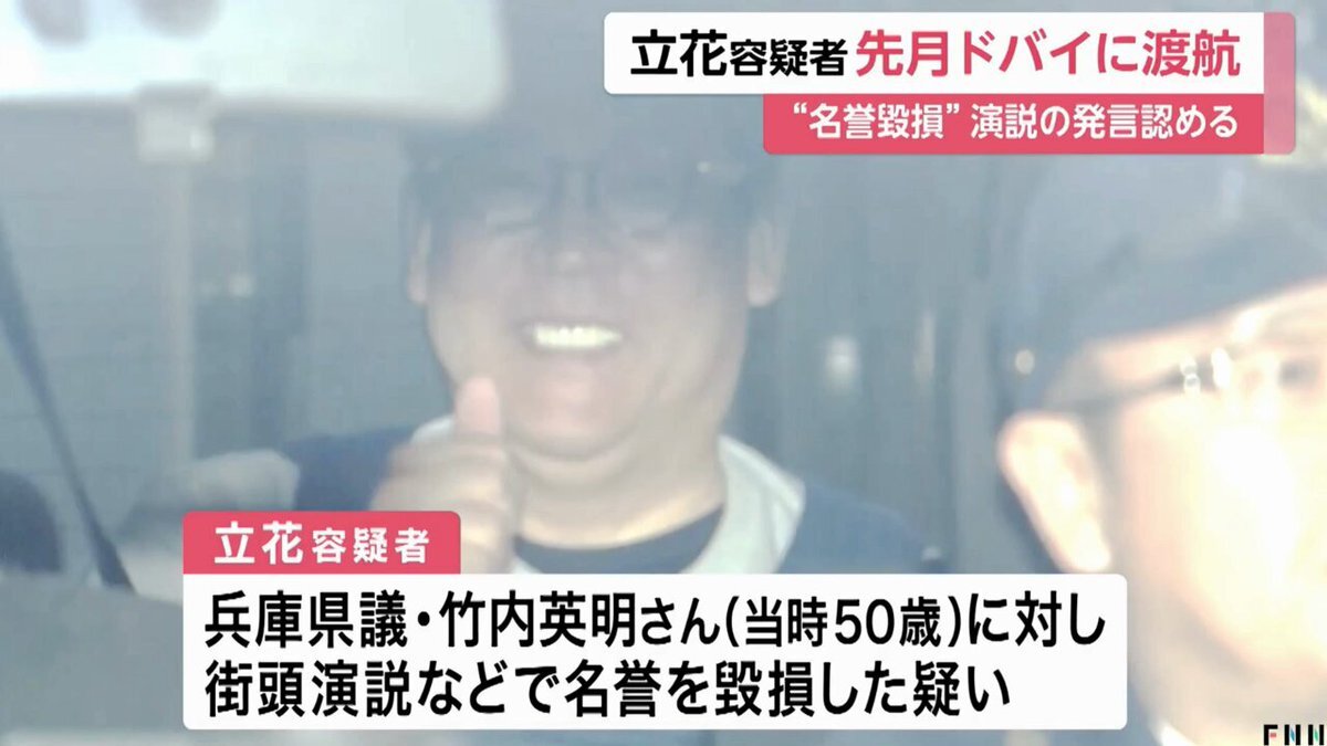 【逮捕の理由はドバイ😅】 立花容疑者は先月末ドバイに渡航。ドバイと日本は犯罪人引き渡し条約を締結しておらず、警察は、立花容疑者が今後、逃亡や証拠隠滅する恐れがあるとみて逮捕に踏み切った。 ⬇️カメラに親指立て笑顔…立花孝志容疑者ドバイに渡航明らかに…警察は“逃亡の恐れ”と判断し逮捕