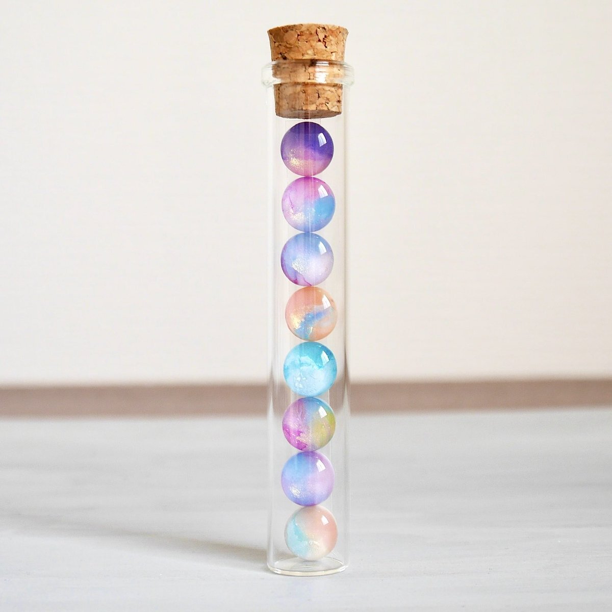返信先:@Apis3281k試験管と試験管立てとフラスコとビーカーを100均で用意してください。 1本にアサイー茶、1本にバタフライピー茶を入れ、フラスコに両方を少しずつ入れ反応を楽しんだ後、ビーカーにアサイー茶、バタフライピー茶をソッと注いでツートンカラーにし、シロップを入れシロップのうねりを楽しんでください。