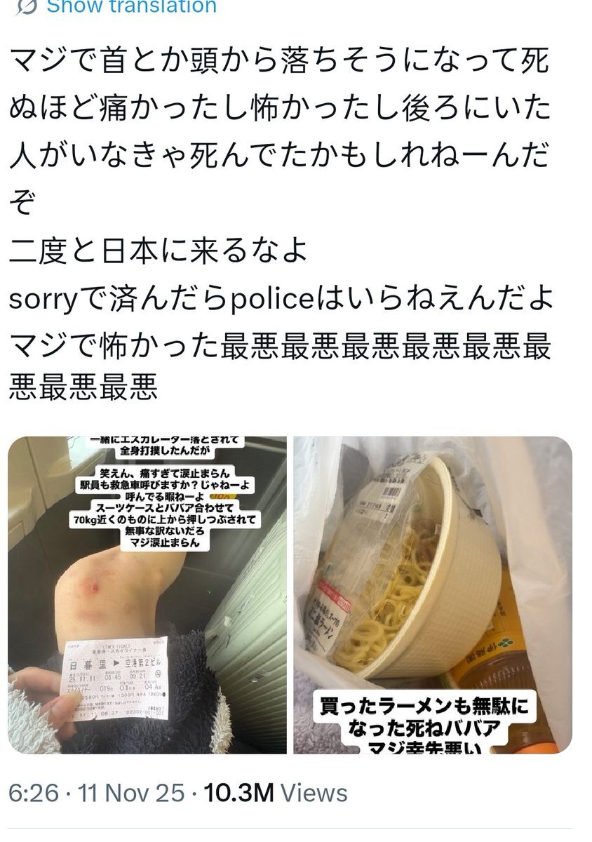 すみません、余りに伸び過ぎているので追記させてください。 エスカレーターの前にいたのは中国か韓国人のお母様と娘さんの二人でした。 お母様の方がエスカレーターの途中で、持っていたスーツケースごと下にいた私の方へ落下してきました。 巻き込まれる形で私も全身打撲を追いましたが、お母様→ x.com/lettaso_lovech…